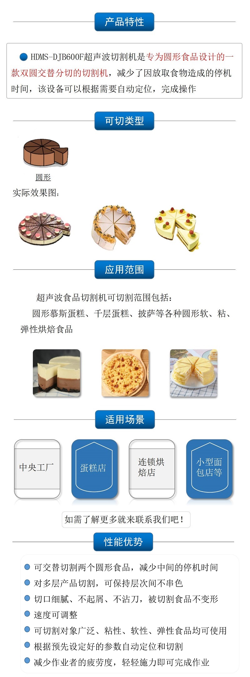 該設備配備雙把超聲波刀片,既可切方蛋糕,也可同時切兩個圓蛋糕,效率更高